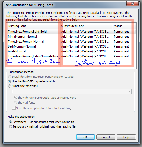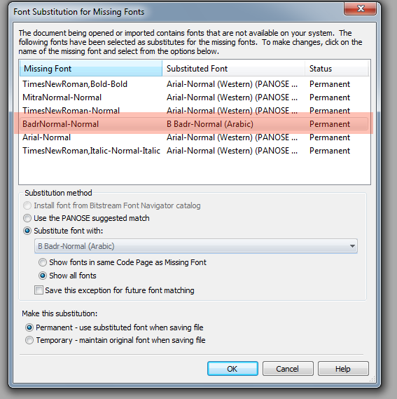 بعد از انتخاب تمامی فونت های جایگزین ok را فشار دهید.توجه کنید که حتما نام فونت های جایگزین را بر اساس نام فونت های از دست رفته انتخاب کنید .برای مثال در تصویر زیر فونت بدر در قسمت جایگزین بر اساس این نام در قسمت فونت از دست رفته انتخاب شد است.