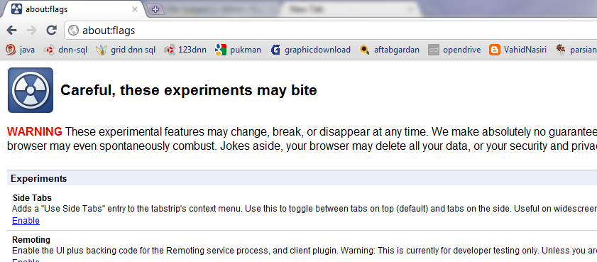 حال مرورگر کروم را باز کنید در قسمت آدرس عبارت about:flags را تایپ کنید .صفحه ای مانند زیر باز میشود :