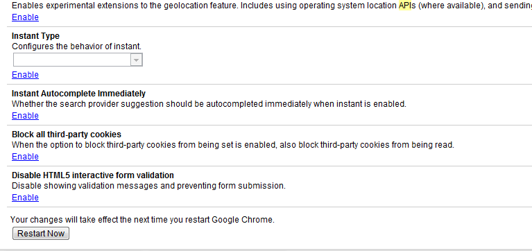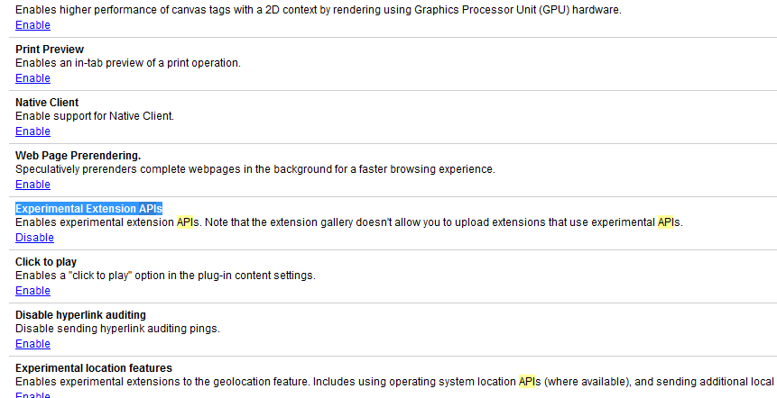 دنبال عبارت Experimental Extension APIs بگردید و روی enable کلیک کنید تا مانند تصویر زیر شود :