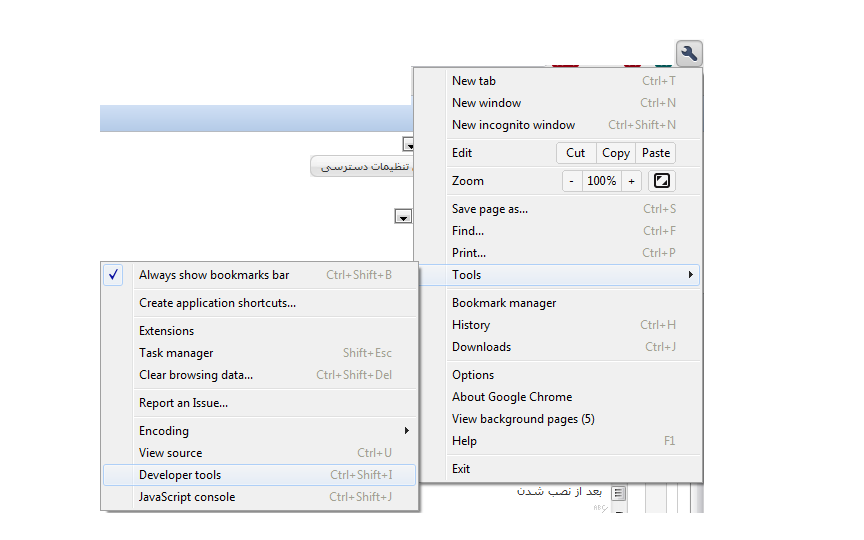 بعد از نصب شدن افزونه مانند تصویر زیر با رفتن به منوی بالا که شکل آچار است سپس Tools گزینه ی Developer tools را انتخاب کنید :