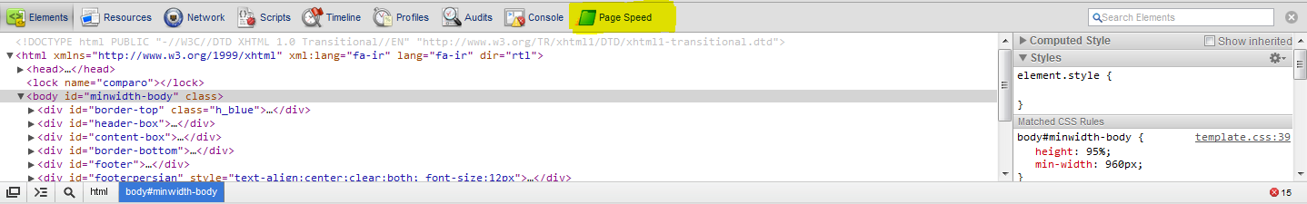 با فشردن این گزینه پنجره ای در پائین مرورگر باز میشود .ابتدا سایت مورد نظر که قصد تست عملکردش را دارید باز کنید سپس اولین گزینه پنجره پائین باز شده یعنی Page Speed را بفشارید :(برای بزرگتر دیدن عکس روی آن کلیک کنید)